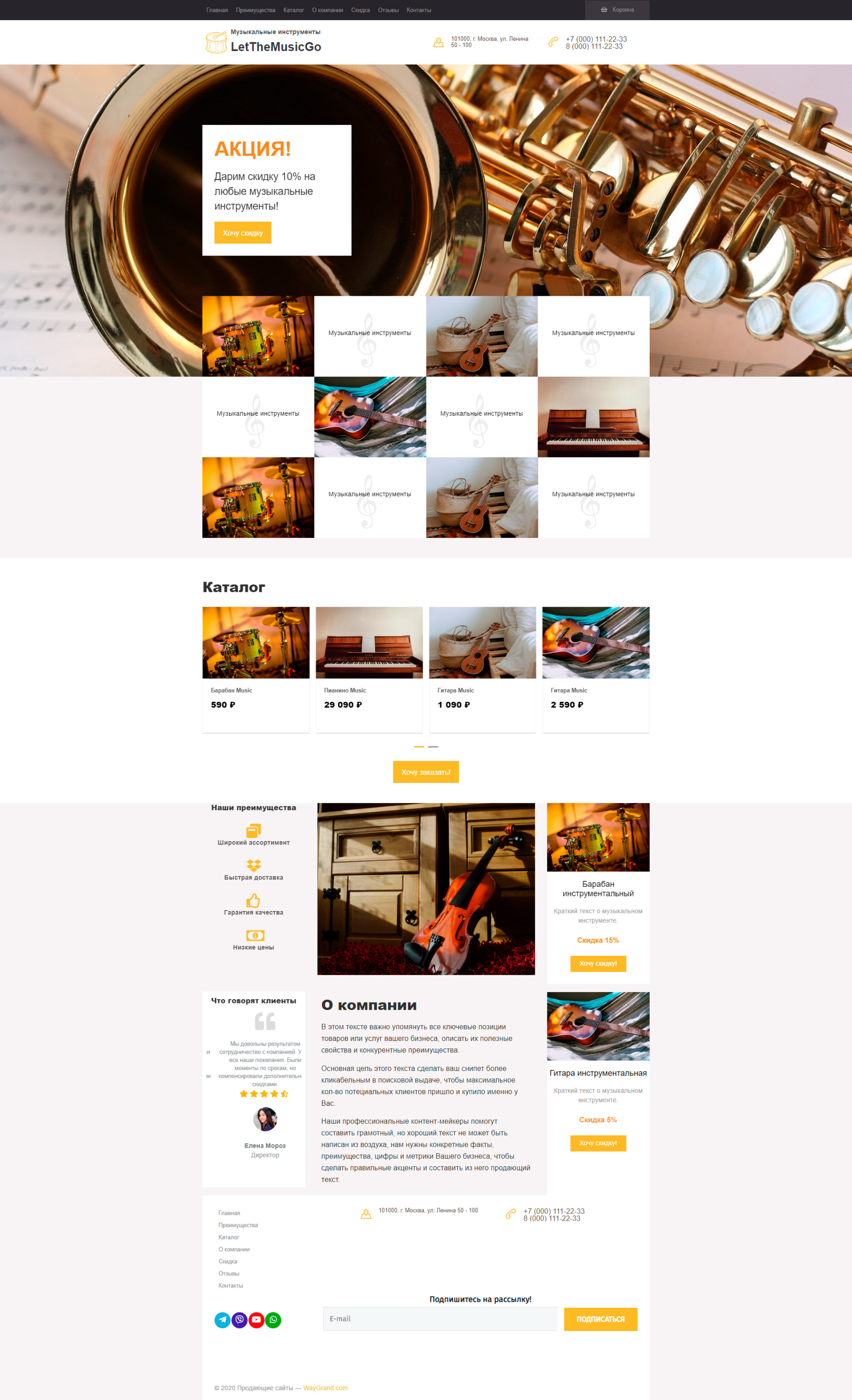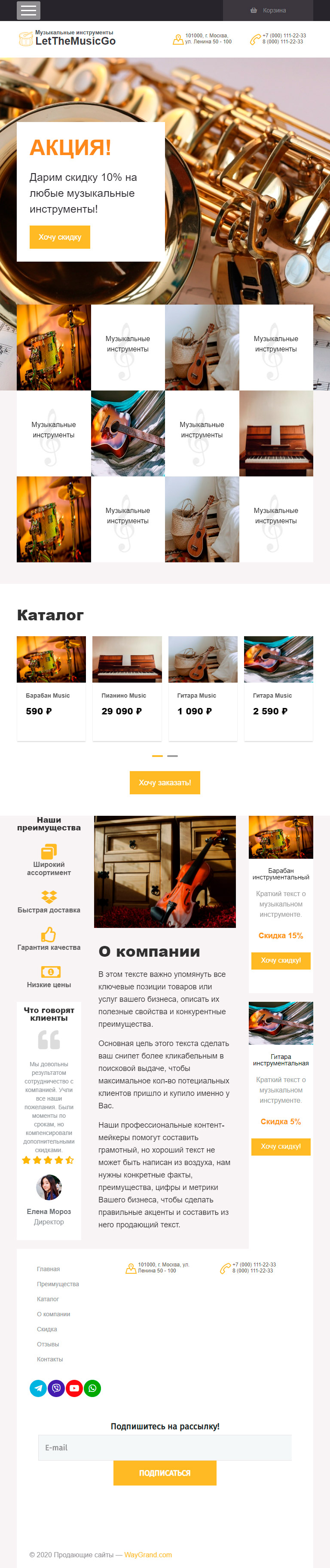 Закажите готовый продающий сайт лендинг #0710201 в Южно-Сахалинске за 1-3 дня «под ключ»: свёрстан, отрисован и готов к рекламе. Тематика шаблона «Музыкальные инструменты».